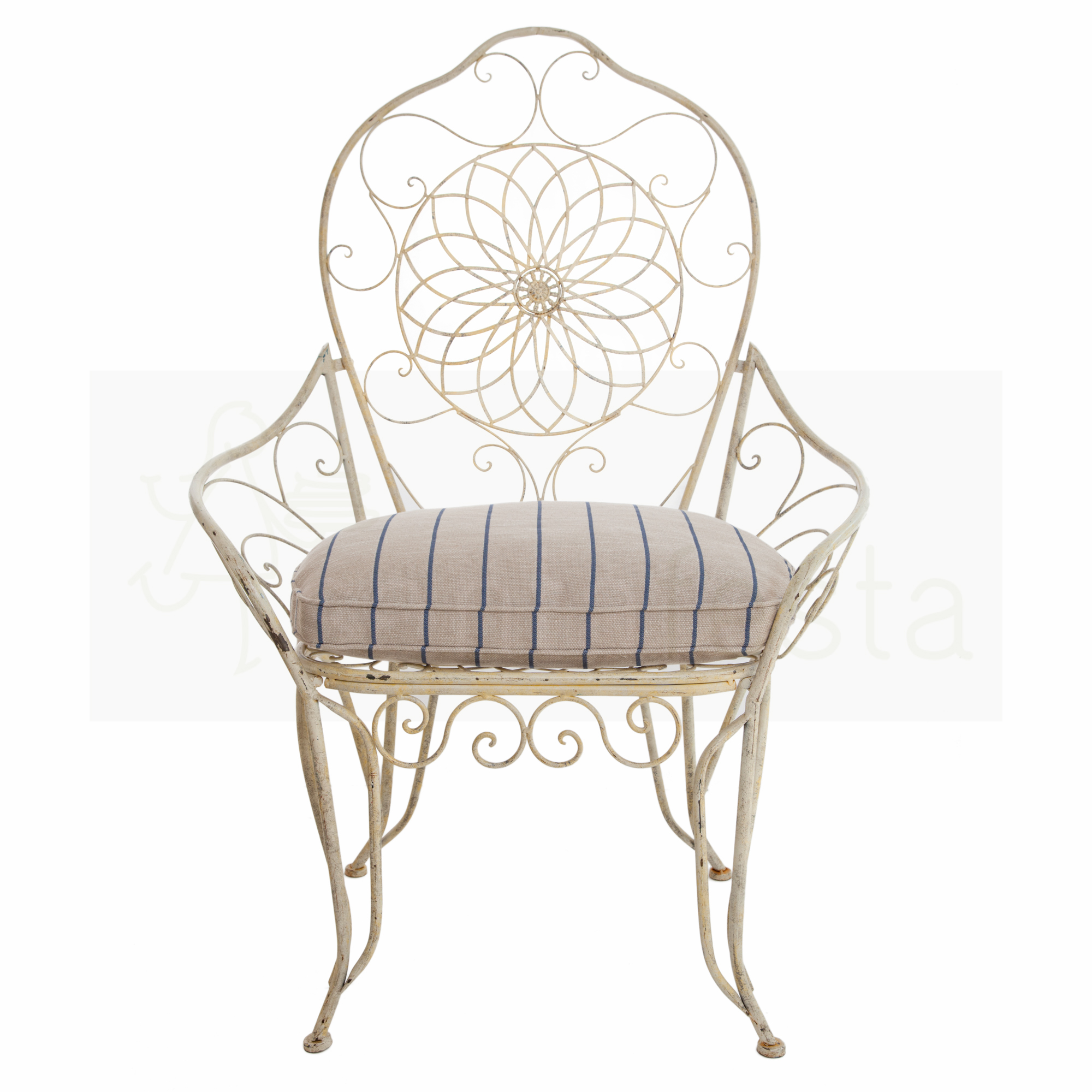CADEIRA FERRO ROCOCÓ C/ ASSENTO LISTINHA AZUL